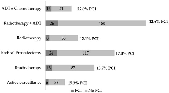 Figure 1 presents the distribution of PCI among patients with prostate cancer proposed for different treatments. PCI was more frequent (22.6%) among those proposed for ADT alone or with chemotherapy, and less frequent (12.1%) among those proposed for radiotherapy (external beam radiation with no hormonal treatment).