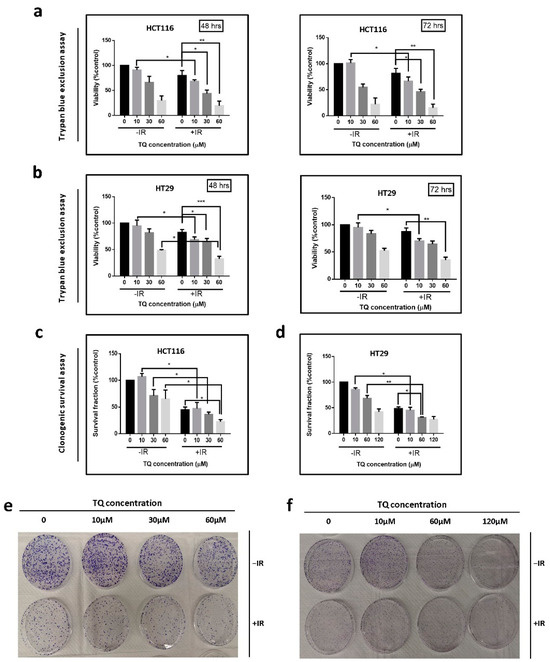 We then studied the effect of TQ and IR on the viability and colony formation ability (long-term survival) of HCT116 and HT29 cells using Trypan blue exclusion (Figure 1a,b) and clonogenic survival assays (Figure 1c–f). Cells were treated with TQ alone, IR (2 Gy) alone, or TQ followed by IR. While treatment of HCT116 and HT29 cells with 10 µM TQ alone did not inhibit cell viability at 48 h, combining the same doses of TQ and IR caused significant inhibition of cell viability when compared to TQ alone (Figure 1a,b). A similar effect of TQ and IR combination was observed in HCT116 p53 null and DLD1 cells (Figure S3c,d). Combining 10 µM TQ with 2 Gy IR led to a 32% and 26% inhibition of HCT116 and HT29 cell viability, respectively. A combination of 30 µM TQ and 2 Gy IR led to a significant reduction in HCT116 and HT29 cell viability at 48 h, when compared to IR alone. Importantly, the effect was similar to TQ alone (Figure 1a,b). A similar pattern was observed for the other CRC cell lines treated with TQ and IR combinations (Figure S3c,d). In HT29 cells, combined treatment caused a significant ~60% reduction in cell viability compared to either treatment alone, at 10 µM and 60 µM TQ concentrations (Figure 1b).