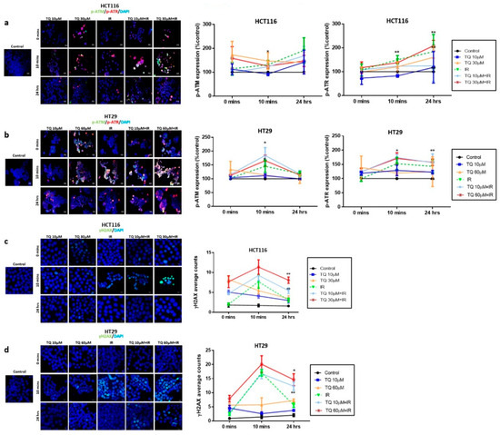 To elucidate the mechanism underlying the observed G2/M arrest in response to TQ and IR, we analyzed the dynamics of γH2AXand the kinases responsible for its phosphorylation during DNA damage response (DDR), mainly ATM and ATR expression (Figure 2). ATM and ATR are members of the phosphatidyl inositol 3-kinase-like family of serine/threonine protein kinases (PIKKs) and are involved in the regulation of G2/M checkpoint. To check whether G2/M arrest is ATM- or ATR-dependent, we analyzed the dynamics of these regulators over a 48 h period (Figure 2a,b). HCT116 and HT29 cells were treated with TQ for 24 h followed by irradiation at 2 Gy. Cells were then fixed at 0 min, 10 min, and 24 h post irradiation, followed by permeabilization and staining for p-ATM and p-ATR and for the DNA damage and repair marker, γ-H2AX. We observed similar activation of ATM and ATR in the two cell lines. Interestingly, combining 30 µM TQ and IR in HCT116 cells led to a significant increase in p-ATM, 10 min after irradiation (Figure 2a). At 24 h, the levels of p-ATM were high in combination-treated HCT116 cells but were not significant compared to the control. p-ATR was upregulated 10 min post irradiation in HCT116 cells treated with IR alone or combination, and this increase was persistent at 24 h, especially in cells treated with combination of 30 µM TQ and IR (for more details check Table S3). In HT29 cells, the increase in p-ATM and p-ATR 10 min post irradiation was insignificant compared to the control; however, when cells were treated with either 10 µM or 60 µM TQ prior to irradiation, the levels of both enzymes significantly increased 10 min after irradiation (Figure 2b, Table S4). Importantly, at 24 h the levels of p-ATM were similar between the HT29 combination-treated cells and control cells. On the other hand, the level of p-ATR remained significantly high in cells treated with 60 µM TQ and IR.