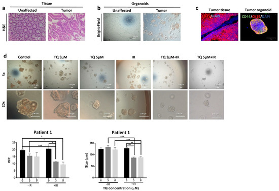 TQ radiosensitizes patient 1-derived rectal cancer organoids and reduces their organoid-forming ability and size. (a) Representative images of H&E stain of unaffected rectum and rectal cancer tissue from patient 1. (b) Representative bright-field images of organoids derived from unaffected rectum and rectal cancer samples (patient 1). (c) Immunofluorescent images of rectal tumor issues and organoids stained for CD44 and CK19. Images were obtained using confocal microscopy. (d) Representative bright-field images of organoids derived from rectal cancer patient 1 sample and treated with TQ (3 and 5 µM), radiation (2 Gy), or combinations. Fresh unaffected and tumor tissues were digested, and single cells were resuspended in 90% Growth Factor reduced Matrigel and 10% serum-free colon media and allowed to grow in serum-free colon media (without treatment). Generated organoids are referred to as G1 organoids. Organoids were propagated to G2 and treated with TQ, IR, or combinations. OFC and size were calculated, and average values were reported as mean ± SEM (* p < 0.05, ** p < 0.01, *** p < 0.001). Images were visualized by Axiovert inverted microscope at 10× magnification. Scale bar for bright-field images is 100 µm and for immunofluorescent images is 50 µm.