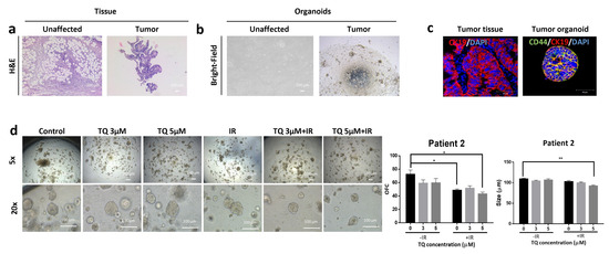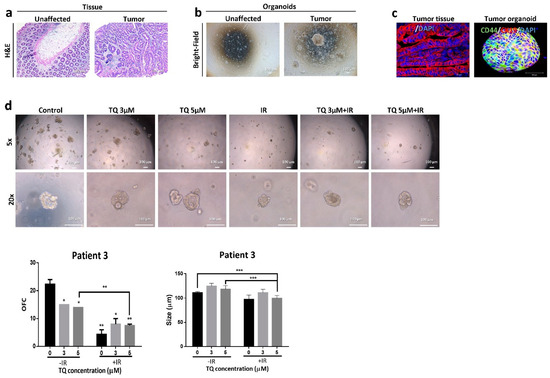 Tissues were processed using protocols described by Boehnke K. et al. [30]. Tissues from patients were rinsed with Hank’s Balanced Salt Solution (Gibco, Waltham, MA, USA), minced using sterile scalpels, and digested in adDMEM/F12 (Gibco) supplemented with dihydrochloride kinase inhibitor, Y-27632, 1% P/S, collagenase IV (Sigma-Aldrich, Darmstadt, Germany), and amphotericin B (Sigma-Aldrich, Darmstadt, Germany) at 37 °C for 60 min. During incubation, tissue fragments were mechanically dissociated by repetitive pipetting. The suspension was filtered through a 40 µm cell strainer (Corning) to remove undigested fragments. Isolated single cells were seeded in 24-well plates with Matrigel in a 9:1 ratio at a cell density of 20,000 cells/well. A volume of 20 µL was plated in the middle of the well. Plates were placed upside down in the incubator for 30 min to allow Matrigel to solidify. Cells were cultured with adDMEM/F12 with various factors added to maintain tumor’s biological traits and growth activity. Medium (supplemented with Y-27632) without treatment was changed every 2–3 days. Organoids were propagated at day 10–12. Ice cold adDMEM/F12 medium without factors was added to detach and collect Matrigel with organoids. Organoids were then pelleted and dissociated enzymatically using TrypLE on a shaking platform for 5 min at 37 °C. TrypLE was inactivated by adding adDMEM/F12 containing 5% FBS. Following centrifugation, cells were resuspended in adDMEM/F12 and centrifuged again. Finally, pellet was resuspended in Matrigel and cells plated as described above. Medium with or without TQ was refreshed every 2–3 days and organoids were irradiated at day 4. Organoids were counted at day 10–12 of passage under inverted microscope at 10× magnification. Images were taken and analyzed by Carl Zeiss Zen 3.1.0.0000 image software to determine size. OFC was reported as the number of organoids counted.