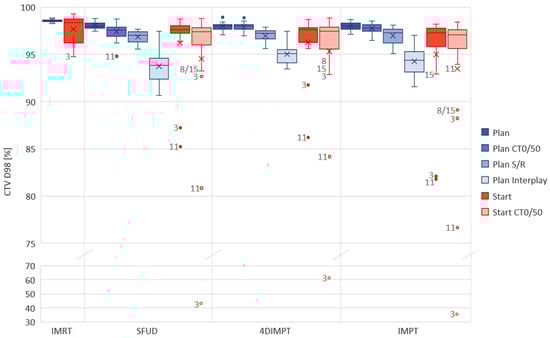 | CTV D98% (%) | Plan CT0/50 | 97.5 (94.8–98.8) | 98.0 (97.0–99.0) | 97.8 (96.5–98.5) |