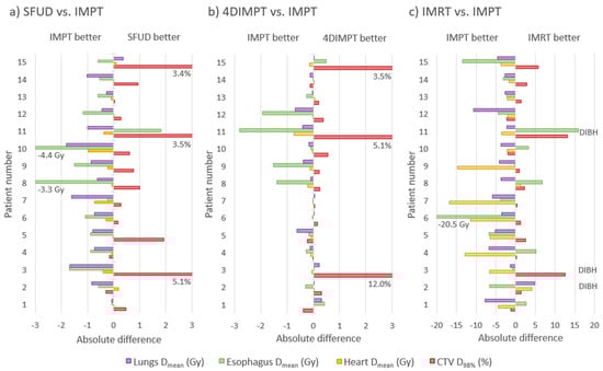 | Lungs V5Gy (%) | −1 (−5/7) | −1 (−11/26) | −2 (−11/26) | −1 (−12/28) |