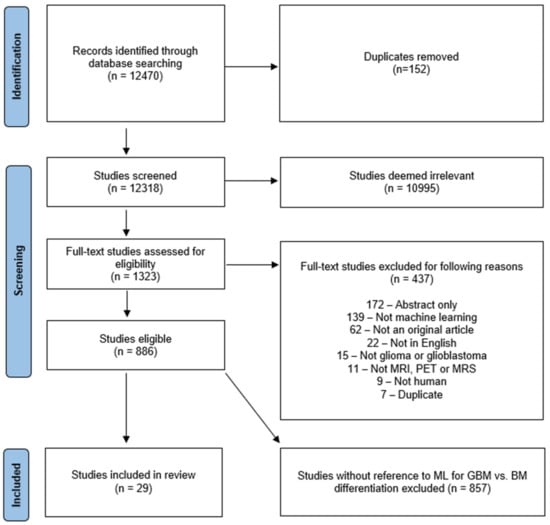 This systematic review was registered with the International Prospective Register of Systematic Reviews (PROSPERO) under the registration number CRD42020209938 and conducted according to the guidelines of the PRISMA (Preferred Reporting Items for Systematic Reviews and Meta-Analyses of Diagnostic Test Accuracy) [12] statement. To collect all relevant original research on the applications of AI in neuro-oncology, database searches of Ovid Embase, OVID MEDLINE, Cochrane trials (CENTRAL), and Web of Science—Core Collection were conducted by a clinical librarian (A.B.) in September 2020, January 2021, and September 2021, respectively. The search strategy included both keywords and controlled vocabulary combining the terms for: “artificial intelligence”, “machine learning”, “deep learning”, “radiomics”, “magnetic resonance imaging”, “glioma”, as well as related terms. The search strategy was independently reviewed by a second institutional librarian. All publications identified by the search were subjected to a screening in Covidence software (Veritas Health Innovation Ltd. Melbourne, Australia). The search identified 12,470 candidate articles (Figure 1). 152 duplicates were removed and screening of the remaining 12,318 articles was conducted by a neuroradiology attending (M.A.), radiology resident (H.S.) and three graduate students (L.J., W.B. and M.v.R.). The board-certified neuroradiology attending (M.A.) resolved ambiguous screening conflicts. The abstract review further excluded 10,995 articles that lacked pertinence to neuro-oncology and ML. A total of 1323 articles were reviewed at full-text level and evaluated for eligibility for inclusion in the review. For reviewer-independent uniformity in screening, 8 exclusion criteria were predefined: (1) Abstract-only; (2) No application of ML reported; (3) Not an original article; (4) Not published in English; (5) No investigation of glioma/glioblastoma; (6) Unrelated to MRI, magnetic resonance spectroscopy (MRS), and positron emission tomography (PET) imaging; (7) No human research subjects; (8) Duplicates. Due to fulfilment of at least one of those criteria, 437 additional studies were excluded. 886 eligible full text studies were then reviewed by either a radiology resident (H.S.) or a graduate student (L.J., W.B. and G.C.P.), in addition to a second review by the board-certified neuroradiologist (M.A.). Twenty-nine studies that were identified to specifically investigate the differentiation of glioma from brain metastasis were then analyzed in the present study. The search strategy is provided in the Supplementary Materials (Figure S1).