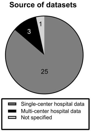 The investigated articles predominantly made use of local single-center hospital datasets (n = 25). Three studies were conducted on hospital data from multiple datasets. In one study, the source of data was not specified and is unclear [16] (Figure 2).