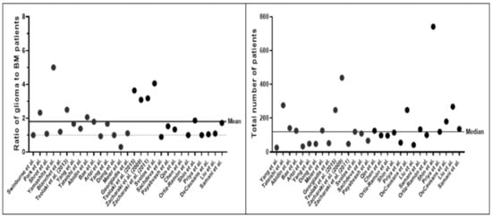 The total numbers of subjects described by the studies were overall small, averaging at 154.10 ± 147.25 (mean ± SD) patients. Deep learning (DL) studies used larger datasets, averaging at 350.25 ± 99.00 (mean ± SD). Datasets were found to exhibit a glioma-to-BM ratio of 1.80 (±1.10):1 (Figure 3). While every study presented a ML model for differentiation between gliomas and brain metastasis, classification tasks and inclusion criteria for subjects varied. Ten studies included further tumor entities, such as atypical meningioma [30] or primary CNS lymphoma [13] as prediction classes. While 15 studies specified inclusion of patients with only solitary brain metastasis, this was not explicitly mentioned in nine studies. Five studies explicitly stated the inclusion of BM patients with multiple lesions. Twenty studies reported the exclusive investigation of GBM. The rest of the studies (n = 9) also included lower-grade and/or atypical glioma patients. Tsolaki et al. [28] performed intra-class subgroup analyses and compared classification accuracy for differentiation of brain metastases against different glioma grades. Artzi et al. [23] and Meier et al. [26] differentiated between multiple types of brain metastases for further subtype analyses of brain tumor etiology.