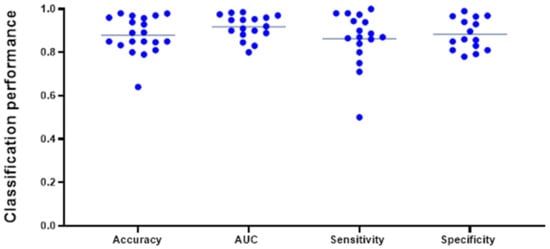 All performance metrics (accuracy, sensitivity, specificity, area under the receiver operating characteristics curve (AUC)) for the best performing classifier from each study were aggregated, tabulated, and displayed using GraphPad Prism version 8.3.4 (GraphPad Software, San Diego, CA, USA, www.graphpad.com (accessed on 1 March 2022)). As benchmark for definition of the best performing classifier from a study, we referred strictly to the AUC. When AUC was not reported, classification accuracy was considered for the classifier ranking. The performance metrics of the best classifiers were pooled; however, only algorithms with pairwise classification between gliomas and brain metastases were considered for this synthesis. The remaining studies presented multiclass approaches and did not provide dichotomized model discrimination measures. Internally validated and externally validated classification results were reported separately.