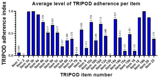 Bar graph of TRIPOD adherence index, a measure for degree of satisfaction for each TRIPOD item applicable in model development studies. Item 11 (Risk groups) was applicable in none of the studies at hand. Item 21 (Supplementary information) is not shown, as it is not included in overall scoring according to official guidelines. Item labels are as follows: 1—Title, 2—Abstract, 3a—Background, 3b—Objectives, 4a—Source of data (Study design), 4b—Source of data (Study dates), 5a—Participants (Study setting), 5b—Eligibility criteria, 5c—Participants (Treatments received), 6a—Outcome (Definition), 6b—Outcome (Blind assessment, 7a—Predictors (Definition), 7b—Predictors (Blind assessment), 8—Sample size, 9—Missing data, 10a—Statistical analysis (Predictors), 10b—Statistical analysis (Model development), 10d—Statistical analysis (Model evaluation), 13a—Flow of participants, 13b—Participant characteristics, 14a—Number of participants and outcomes, 14b—Model development (Predictor and outcome association), 15a—Full model specification, 15b—Model explanation, 16—Model performance, 18—Limitations, 19b—Interpretations, 20—Implications, 22—Funding. Note that items 15a (Full model specification) and 16 (Model performance) are among the TRIPOD items with lowest adherence in the surveyed studies despite having a paramount role for model reproducibility and successful translation to the clinic.