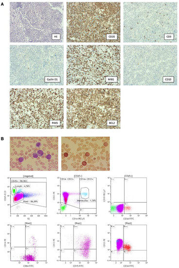 Diagnostic workup of DLBCL and AML of patient. (A) Fine needle biopsy of an abdominal lymph node showing an aggressive B-cell-lymphoma expressing CD20, PAX5 and BCL2, without expression of CD3 (some admixed non-neoplastic T-cells are positive), Cyclin D1, and CD10, corresponding to a diffuse large B-cell-lymphoma (DLBCL). MIB1 staining indicates expression of Ki-67, a nuclear protein associated with cell proliferation. (B) Diagnostic workup from the peripheral blood for AML. Upper panel: cytomorphology. Upper left: Pappenheim stain showing blasts with monocytic morphology and prominent nucleolus. Upper right: esterase staining showing esterase positive blasts. Lower panel: immunophenotyping showing AML blasts with positive expression of CD33+ CD64+ CD13+ and CD15+ and a subpopulation with CD34+, indicative of myelomonocytic leukemia. No expression of B cell marker CD19.