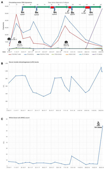 Time course of patient’s disease and treatment. (A) Amount of ctDNA in the patient’s blood in copies per milliliter. Above the diagram, the therapy regimen is shown. Blue vertical arrow/pill box, first day of each new treatment cycle; green arrow, treatment period; red box, therapy interruption due to neutropenia; syringe, administration of short-acting granulocyte colony-stimulating factor; camera, clinical imaging (CT and PET-CT, see Figure 2). The four time points with targeted NGS of cfDNA are marked with a circled asterisk. (B) Levels of serum lactate dehydrogenase (LDH). The upper limit of normal is 244 U/L. (C) White blood cell count (leukocyte count).