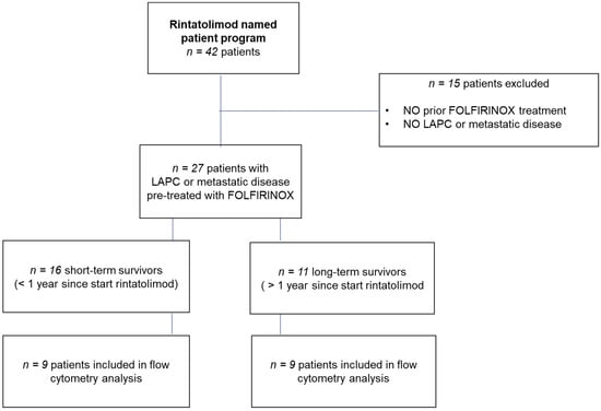 Inclusion criteria for the study group were LAPC; metastatic PDAC or recurrence after resection; completion of standard of care treatment (i.e., resection and/or chemotherapy); and adequate hematologic, renal, and hepatic function. Exclusion criteria were a history of another malignancy in the previous five years before inclusion and concomitant immunosuppressive medication use. Included in the analysis were only data of patients pretreated with FOLFIRINOX and with radiologically stable disease according to response evaluation criteria in solid tumors (RECIST) criteria 1.1 at least 6 weeks or more after the last cycle before treatment with rintatolimod.