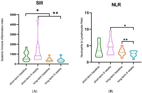 (A) Systemic immune inflammation index (SIII) in short-term survivors (n = 9) and long-term survivors (n = 9). *: p = 0.010 (Mann–Whitney U test); **: p = 0.0005 (Mann–Whitney U test_. (B) Neutrophil to lymphocyte ratio (NLR) in short-term survivors and long term-survivors. *: p = 0.006 (Mann–Whitney U test); **: p = 0.014 (Mann–Whitney U test).