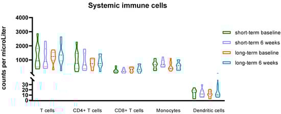 Systemic immune cells in short-term survivors (n = 9) versus long-term survivors (n = 9). All p-values ≥ 0.05 using a paired sample t-test.