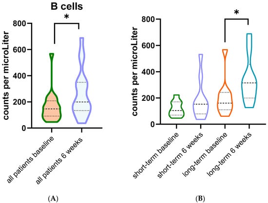 (A) B cells in circulating blood of all patients treated with rintatolimod (n = 18, *: p = 0.001 from paired sample t-test). (B) B cells in circulating blood of short-term survivors (n = 9) and long-term survivors (n = 9 *: p = 0.002 from paired sample t-test).