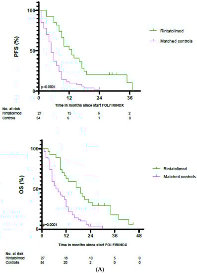 All groups (rintatolimod treatment group (n = 27), matched controls (n = 54) and subset of matched controls (n = 27)) were comparable with regard to age, sex, disease stage, and number of FOLFIRINOX cycles (Table 2). Most of the patients in all groups were males in the metastatic disease stage. The median number of FOLFIRINOX cycles was 8.0. The total matched control group was incomparable to the rintatolimod group in terms of progression-free intervals before the start of treatment with rintatolimod (Table 2). The matched controls had a significantly shorter median progression-free interval calculated from the last FOLFIRINOX dose compared to the time in months from last FOLFIRINOX dose to start of rintatolimod in the treatment group. The progression-free interval was comparable between both groups.