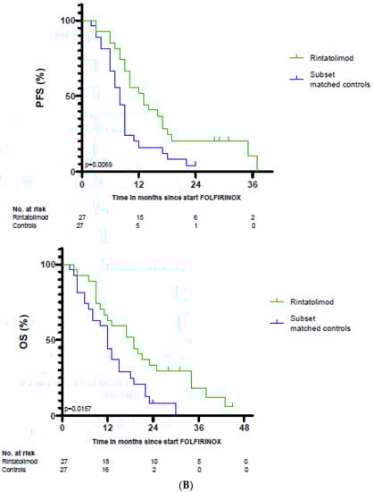 (A) Kaplan–Meier estimates for progression-free survival and overall survival of patients with locally advanced and metastatic pancreatic cancer treated with rintatolimod (n = 27) compared to matched controls (n = 54). (B) Kaplan–Meier estimates for progression-free survival and overall survival of patients with locally advanced and metastatic pancreatic cancer treated with rintatolimod (n = 27) compared to subset of matched controls (n = 27). p-values are from the Cox proportional hazards model.