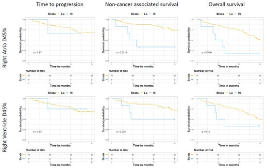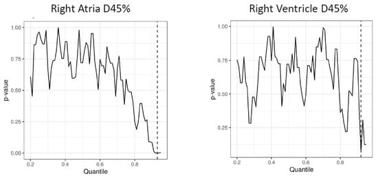 | Right Atria D45% | 8.0 (1.0–62.5) | 0.048 | 7.4 (1.2–45.7) | 0.029 |