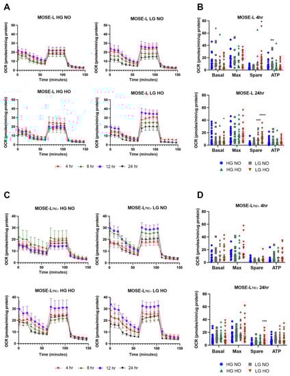 Oxygen consumption rate (OCR) and metabolic outputs in spheroids over time. OCRs were graphed as time traces to compare overall data (A) MOSE-L and (C) MOSE-LTICv. Metabolic outputs were calculated from OCR trace values for (B) MOSE-L and (D) MOSE-LTICv. Data are represented as the mean ± SEM and ANOVA with Dunnett’s multiple comparisons test to compare to HG NO. * p < 0.05 compared to HG NO; ** p < 0.01 compared to HG NO; *** p < 0.001 compared to HG NO; **** p < 0.0001 compared to HG NO. Abbreviations: high glucose (HG); low glucose (LG); normoxia (NO); hypoxia (HO).