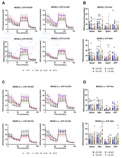 Oxygen consumption rate (OCR) and metabolic outputs in S1P-treated spheroids. (A) MOSE-L time traces, (C) MOSE-LTICv time traces. Metabolic outputs were calculated from OCR trace values for (B) MOSE-L and (D) MOSE-LTICv treated with S1P. Data are represented as the mean ± SEM and ANOVA with Dunnett’s multiple comparisons test to compare to HG NO. * p < 0.05 compared to HG NO; ** p < 0.01 compared to HG NO; *** p < 0.001 compared to HG NO; **** p < 0.0001 compared to HG NO. Abbreviations: high glucose (HG); low glucose (LG); normoxia (NO); hypoxia (HO).