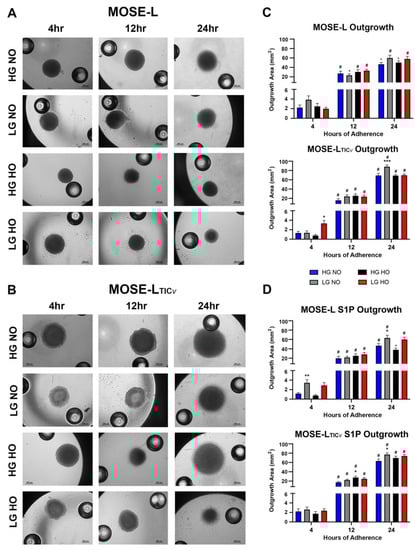 Spheroid outgrowth increased over time of adherence. Outgrowth of spheroids was measured in MOSE-L and MOSE-LTICv in brightfield images quantified using NIS Elements and ImageJ (A) Representative images of MOSE-L spheroids (B) Representative images of MOSE-LTICv spheroids, (C) Quantification of outgrowth for MOSE-L and MOSE-LTICv spheroids, and (D) for S1P-treated MOSE-L and MOSE-LTICv. Data are represented as the mean ± SEM. * p < 0.05 compared to HG NO; ** p < 0.01 compared to HG NO; *** p < 0.001 compared to HG NO. + p < 0.05 compared to previous time point; ^ p < 0.01 compared to previous time point; # p < 0.001 compared to previous time point. Abbreviations: high glucose (HG); low glucose (LG); normoxia (NO); hypoxia (HO).