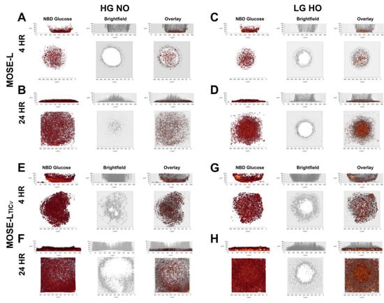 Glucose uptake in spheroids at 4 and 24 h in different conditions. Images represent 3D reconstructions of confocal imaging and reconstruction of NBD-glucose, brightfield, and overlay. Measurements were taken in MOSE-L and MOSE-LTICv spheroids in HG NO and LG HO at 4 and 24 h of adherence. Spheroids are displayed as viewed from the side (top image) and from the top (bottom image). (A) MOSE-L 4 h HG NO (B) MOSE-L 24 h HG NO (C) MOSE-L 4 h LG HO (D) MOSE-L 24 h LG HO (E) MOSE-LTICv 4 h HG NO (F) MOSE-LTICv 24 h HG NO (G) MOSE-LTICv 4 h LG HO (H) MOSE-LTICv 24 h LG HO. Abbreviations: high glucose (HG); low glucose (LG); normoxia (NO); hypoxia (HO).