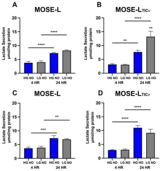 Lactate secretion of spheroids at 4 and 24 h of adhesion. Lactate secretion was measured in spheroids adherent for 4 or 24 h in optimal (HG NO) and limiting (LG HO) conditions in (A) MOSE-L and (B) MOSE-LTICv as well as HG HO and LG NO in (C) MOSE-L and (D) MOSE-LTICv spheroids. Data are represented as the mean ± SEM. ** p < 0.01 compared to HG NO; bars with ** p < 0.01 compared to 4 h; bars with *** p < 0.001 compared to 4 h; bars with **** p < 0.0001 compared to 4 h. Abbreviations: high glucose (HG); low glucose (LG); normoxia (NO); hypoxia (HO).