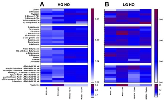 Substrate utilization using MitoPlates™ heat map. Differential utilization of substrates for energy production from intermediates for glycolysis, the TCA cycle, and fatty acid oxidation shown through colorimetric redox assay for MOSE-L and MOSE-LTICv at 4 and 24 h of adherence in (A) HG NO and (B) LG HO. Tryptamine heat map is shown at the bottom of (A,B) with its own heat map quantification scale. Abbreviations: high glucose (HG); low glucose (LG); normoxia (NO); hypoxia (HO).