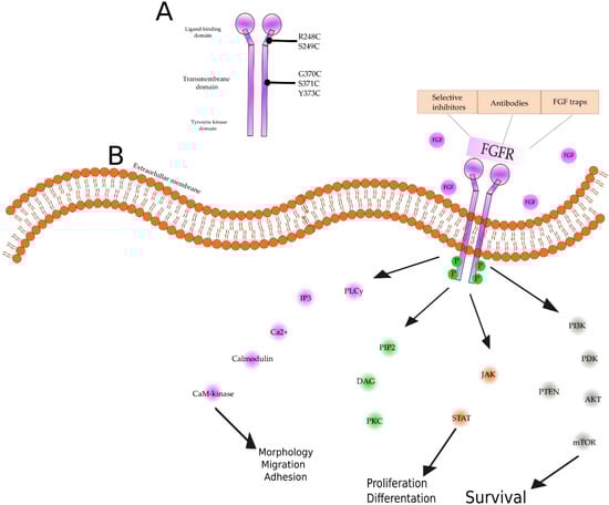 Family of fibroblast growth factor receptors (FGFRs) are tyrosine kinase receptors playing an important role not only in oncogenesis but also in the wild range of cell signaling pathways. From the early stages of embryonic development, they are responsible for key cellular interactions and functions [,]. In classic overview, there are four FGFR (FGFR1–FGFR4) tyrosine kinases and eighteen FGF ligands that activate them. FGFRs are formed with three extracellular binding ligand domains, a transmembrane domain, and an intracellular domain, which is tyrosine kinase []. Depending on the tissue extracellular domain D3, it can alternatively be spliced and formatted as epithelial (“b” form) or mesenchymal (“c” form) [,]. Additionally, recent studies indicate the occurrence of FGFR5/FGFRL1 with unknown function and different morphology [,]. Activation of the receptor is determined by tissue downstream signaling through the RAS–MAPK and PI3K–AKT pathways’ calcium ions and PKC []. Final effects of the pathways are individual for the cell and include mitogenesis in the MAPK pathway, cell survival in the PI3K pathway, and mobility in PKC [] (Figure 1).
