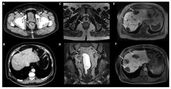 77-year-old patient presenting with constipation and weight loss, a TAP CECT performed shows a rectal mass (A, arrow) associated with two liver hypodense lesions in segments II/IVa and VII suspicious of metastases (B, arrows). No other metastatic site was identified. Rectal MRI for local staging evidences a cT4 cN2 lower rectal tumor invading ipsilateral levator-ani muscle as shown on axial T2 weighted imaging (C, arrow). Coronal T2 weighted imaging evidenced multiple lymph nodes involving the right mesorectum and the right internal iliac region (D, arrows). Liver MRI with hepato-specific contrast agent evidenced three liver metastases respectively involving segments II/Iva, VII and VIII (E, arrows). The patient was considered as oligometastatic and underwent neo- and adjuvant radiochemotherapy, rectal low anterior resection, surgical wedge resection of segments II/IVa, VII and radiofrequency of segment VIII as shown on post-treatment liver MRI (F, arrows) with no recurrent disease at eight years after diagnosis. Abbreviations: TAP: Thoraco-abdomino-pelvic; CECT: contrast-enhanced CT.