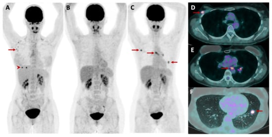 33-year-old patient with advanced NST breast carcinoma. The maximum intensity projection at initial diagnosis (A), showed two breast lesions with focal FDG uptake (arrowhead) and pathological radiotracer uptake by axillary lymph nodes (arrow). The patient was in complete remission after treatment by surgery, chemotherapy and adjuvant radiotherapy (B), followed by of hormonotherapy. Five years later the patient relapsed (C, arrows) with new metastatic lesions, as shown by the fusion images, in the right axilla (D, arrow), in mediastinal and left hilar lymph nodes (E, arrow) and in the lung (F, arrow). The patient was further treated by chemotherapy and local therapy of the metastatic sites: surgery of the right axilla and radiotherapy of the lymph nodes and pulmonary lesion, considered as an oligometastatic recurrence.