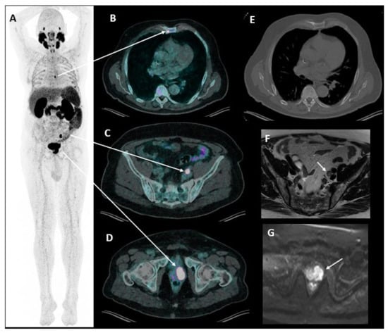 73-year-old patient with suspected prostate cancer due to PSA rise. PSMA PET/CT (A–E) and prostate MRI (F,G) evidenced oligometastatic prostate cancer with two metastatic locations including a focal tracer uptake in the sternum (B) without correlation on CT (E) and one pathologic left external iliac lymph node with focal tracer uptake (C) and enlargement seen on T2 weighted imaging (F). Note the tracer uptake of the primary tumor on the left prostatic lobe (D) with corresponding restricted diffusion on high b-value (G).