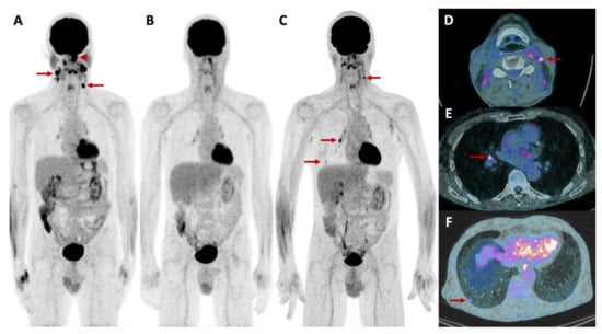 61-year-old patient with a squamous cell carcinoma of the nasopharynx. The maximum intensity projection at initial diagnosis (A), showed the nasopharyngeal lesion with focal FDG uptake (arrowhead) and pathological radiotracer uptake by cervical lymph nodes (arrows). The patient was in complete remission after radio-chemotherapy (B). Six months later the patient presented an oligo-recurrence (C, arrows), as shown by the fusion images, with local left cervical lymph node recurrence (D, arrow), and new metastatic lesions in a right hilar lymph node (E, arrow) and in the lung (F, arrow).