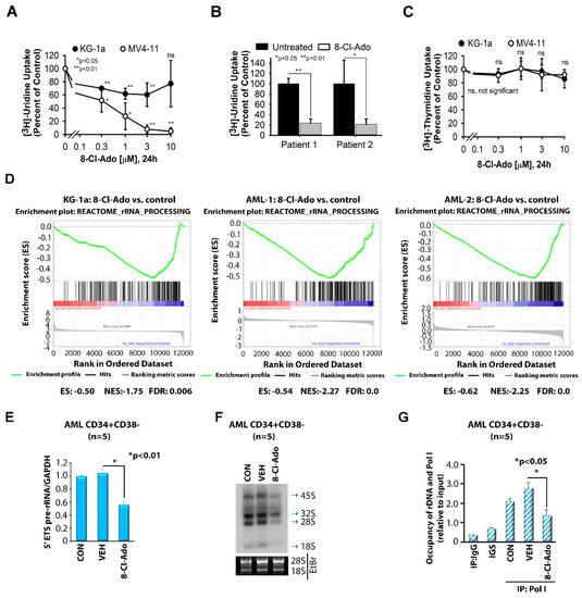 Regulation of rRNA synthesis by 8-Cl-Ado. (A,B) Effect of 8-Cl-Ado on RNA synthesis in AML cells lines (A) and primary AML blast cells (B). Cell lines KG-1a and MV4-11 were incubated with 0, 0.3, 1, 3 or 10 μM 8-Cl-Ado for 24 h. Primary blast cells from 2 patients were incubated with or without 10 μM 8-Cl-Ado for 24 h. In the last hour, [3H]-uridine was added to measure uptake into newly synthesized RNA. (C) Effect of 8-Cl-Ado on DNA synthesis in AML cell lines KG-1a and MV4-11. Cells were incubated with 0, 0.3, 1, 3 or 10 μM 8-Cl-Ado for 24 h. In the last 3 h, [3H]-thymidine was added to measure uptake of newly synthesized DNA. n = 1 (in triplicate). Error bars = standard error. (A–C) n = 1 (in triplicate, KG-1a; in duplicate, MV4-11 and primary AML). (D) Gene set enrichment analysis (GSEA) graphs of genes involved in rRNA synthesis upon treatment of KG-1a and two primary AML cells with 500 nM 8-Cl-Ado for 24 h. n = 2. ES enrichment score, NES normalized enrichment score, FDR false discovery rate. (E–G) LSC-enriched blasts (n = 5) were treated with vehicle control (VEH) or 500 nM 8-Cl-Ado for 24 h. RNA was extracted for measurement of 5′ ETS pre-rRNA (E) or for radioactive labeling with [32P] (F). ChIP assay was performed to measure the level of Pol I recruited to the rDNA promoter. Original blots see Supplementary File S1 (G). GAPDH (E) or 10% input (G) was used as the internal control. (E,G) n = 2, in triplicate. CON, control; VEH, vehicle; 8-Cl-Ado, 8-chloro-adenosine.