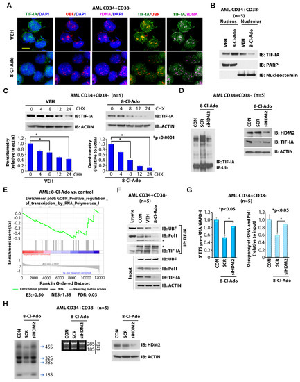 We next dissected the molecular mechanism through which 8-Cl-Ado deregulated rRNA synthesis in AML cells. Transcription of rDNA by Pol I requires a pre-initiation complex consisting of RNA Pol I, upstream binding factor (UBF), selectivity factor 1 (SL-1) and TIF-IA transcription initiation factor. While TIF-IA is required to recruit Pol I to the rDNA promoter, UBF and SL-1 are primarily responsible for DNA binding [29,30]. We observed that 8-Cl-Ado treatment of LSC-enriched primary AML cells disrupted the colocalization of TIF-IA and UBF at the rDNA site, as demonstrated by immunofluorescent and fluorescent in situ hybridization (IF-FISH) with anti-TIF-IA, anti-UBF antibodies and rDNA probes (Figure 2A). The cellular fractionation assay also demonstrated that 8-Cl-Ado treatment resulted in a decline in TIF-IA in the nucleolar fraction with a parallel increase in the nucleus (Figure 2B). Since TIF-IA is a downstream substrate of HDM2 ubiquitin ligase-induced ubiquitylation and degradation [27], we also examined the effects of 8-Cl-Ado on TIF-IA ubiquitylation and stability. Here, 8-Cl-Ado induced the ubiquitylation (Figure 2D) and degradation of TIF-IA (Figure 2C), while knocking down (KD) HDM2 mRNA using siRNA partially rescued the effects (Figure 2D). Of note, 8-Cl-Ado treatment of primary AML cells resulted in the significant inhibition of a gene set involved in transcription regulation by RNA Pol I (FDR 0.03) (Figure 2E), suggesting that 8-Cl-Ado inhibits proper formation of the Pol I pre-initiation transcription complex through downregulation of TIF-IA. To this end, 8-Cl-Ado-induced inhibition of TIF-IA disrupted the rRNA transcription pre-initiation complex, as demonstrated by a decreased interaction of Pol I, UBF and TIF-IA (Figure 2F), leading to the inhibition of Pol I/rDNA binding and rRNA synthesis (Figure 2G,H). Pre-treatment with siRNA against HDM2 (siHDM2) prevented the 8-Cl-Ado-induced downregulation of TIF-IA (Figure 2D), thereby rescuing Pol I/rDNA binding and rRNA synthesis (Figure 2G,H). Taken together, our results indicate that the inhibitory effects of 8-Cl-Ado on rRNA synthesis are mediated through the down-regulation of the TIF-IA protein.