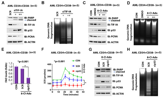 Effects of 8-Cl-Ado on p53 expression and p53-regulated OXPHOS metabolism. (A,B) Effects of TIF-IA KD on expression of p53 and PCNA and on apoptosis. LSC-enriched blasts were transfected with siSCR or siTIF-IA [20 nM (+) and 40 nM (++)] for 24 h. (A) Each lysate was immunoblotted with the indicated antibodies. (B) Genomic DNA was isolated for DNA fragmentation assay. (C,D) Effects of 8-Cl-Ado on levels of TIF-IA, p53, PCNA protein and apoptosis. LSC-enriched blasts were treated with DMSO control or 8-Cl-Ado [500 nM (+) and 1 µM (++)] for 24 h. (C) Each lysate was immunoblotted with the indicated antibodies. (D) DNA fragmentation assay. (E,F) Effects of 8-Cl-Ado on fatty acid oxidation (FAO) and OCR (OXPHOS). LSC-enriched blasts were transfected with siSCR or sip53 (20 nM) for 12 h. The cells were then treated with 500 nM 8-Cl-Ado for additional 24 h. (E) Levels of FAO were measured by the oxidation rate of 3H-palmitic acid. n = 2, in triplicate. (F) Levels of oxidative consumption rate (OCR) were measured by seahorse cell energy testing assay. n = 2, in triplicate. (G,H) Effects of p53 KD on 8-Cl-Ado-regulated apoptosis. LSC-enriched blasts were transfected with siSCR or sip53 (20 nM) for 12 h. The cells were then treated with 500 nM 8-Cl-Ado for additional 24 h. (G) Each lysate was immunoblotted with the indicated antibodies. (H) DNA fragmentation assay. CON, control; SCR, scramble siRNA; 8-Cl-Ado, 8-chloro-adenosine. Target sequences for siRNAs are listed in Supplementary Table S2. Original blots see Supplementary File S1.