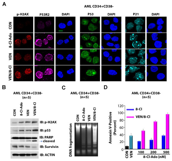 Effects of 8-Cl-Ado plus VEN on p53 signaling and apoptosis. LSC-enriched blasts were treated with 500 nM 8-Cl-Ado, 10 nM VEN or both. (A,B) Levels of p-H2AX, p53 and p21 proteins were measured by immunofluorescence and immunoblotting. Original blots see Supplementary File S1. (C,D) Levels of apoptosis as determined by DNA fragmentation (C) and flow cytometry for Annexin V (D). (D) n = 2, in triplicate. CON, control; VEN, venetoclax; 8-Cl-Ado, 8-chloro-adenosine.