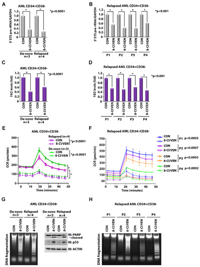 Previous studies showed that LSCs from de novo AML patients are susceptible to the VEN/azacitidine combination, whereas LSCs derived from patients with R/R AML are less sensitive to this treatment [2,10,35]. Of note, it has previously been demonstrated that LSCs from patients with R/R AML, but not with de novo AML, can utilize FAO as an additional metabolic pathway to fuel OXPHOS [11]. Thus, LSCs from R/R AML patients may have a rescuing pathway to antagonize the effects of the VEN-induced loss of BCL-2-dependent, amino acid-driven OXPHOS. We recently demonstrated that the VEN/8-Cl-Ado combination targets FAO and OXPHOS in primary blasts from patients with R/R AML [19]. To investigate the effects of the VEN/8-Cl-Ado combination treatment on LSC-enriched blasts from de novo and relapsed AML patients, we treated CD34+CD38− AML blasts from three patients with de novo AML and four patients with R/R AML with 10 nM VEN and 500 nM 8-Cl-Ado, for 24 h. The VEN/8-Cl-Ado combination treatment suppressed levels of rRNA synthesis (Figure 6A,B), FAO (Figure 6C,D) and OXPHOS (Figure 6E,F) in de novo and relapsed LSC-enriched blast cells. In addition, we observed that the VEN/8-Cl-Ado combination treatment induced apoptosis in LSC-enriched blasts from both de novo and R/R AML patients, as demonstrated by DNA fragmentation, induction of p53 and cleavage of PARP (Figure 6G,H). These results suggest that the VEN/8-Cl-Ado combination is effective not only against de novo AML but also against R/R AML.