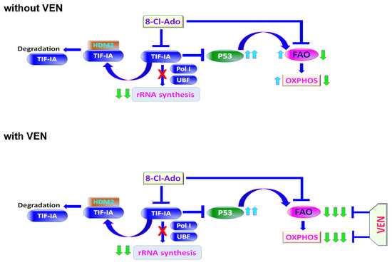 Schematic diagram of a proposed mechanism of synergy of combining 8-Cl-Ado with VEN for targeting of metabolic vulnerabilities in LSC-enriched blasts. Top, in the absence of VEN. Bottom, in the presence of VEN. TIF-IA, transcription initiation factor IA; Pol I, RNA polymerase I; UBF, upstream binding factor; HDM2, human homolog of mouse double minute 2; FAO, fatty acid oxidation; OXPHOS, oxidative phosphorylation; VEN, venetoclax; 8-Cl-Ado, 8-chloro-adenosine.
