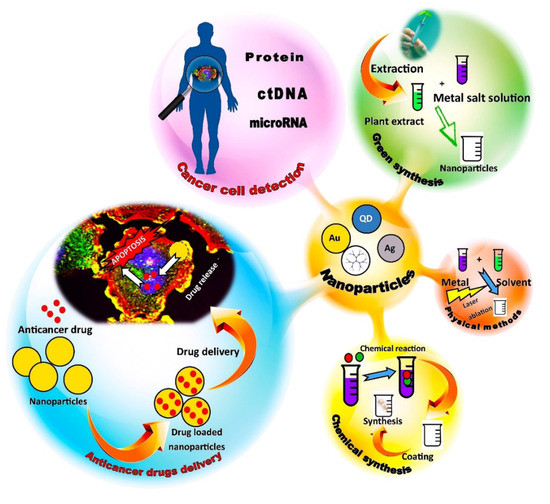 Because plants from the Solanaceae family produce a number of compounds with proven or potential anticancer activity, they may well be used on a large scale as the basis for new systems for the biosynthesis of nanoparticles exhibiting anticancer activity. Combined with the extremely rapid technological progress, this may be the starting point for the development and implementation of completely new and more effective methods of fighting cancer. The general scheme of the synthesis and application of nanoparticles in cancer diagnosis and treatment is presented in Figure 2.