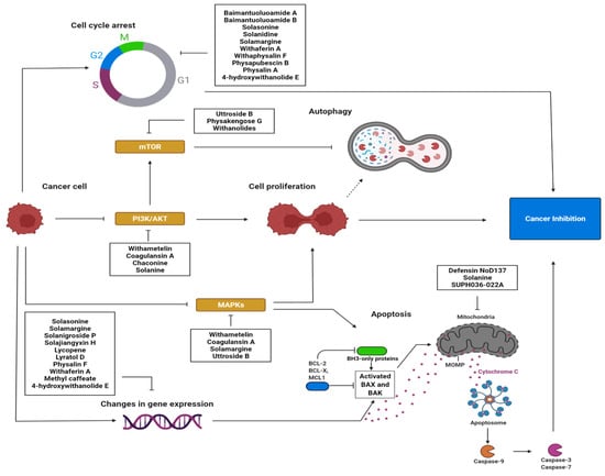 Schematic diagram presenting the potential anticancer effect of compounds from the Solanaceae family through the induction of apoptosis and the activation of signalling pathways in cancer cells (created using BioRender).