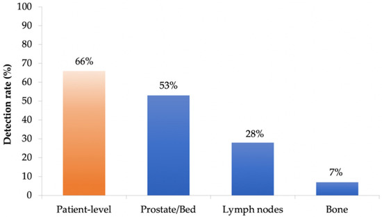Most of positive findings were observed in prostate/prostatectomy bed (53%), thanks to irrelevant urinary interference, compared to lymph node (28%) and bone involvement (7%). Differently, the Bulbul et al. study reported a similar prostatic and extraprostatic detection rate of 35% and 37% in patients with PSA less than 1 ng/mL [11].