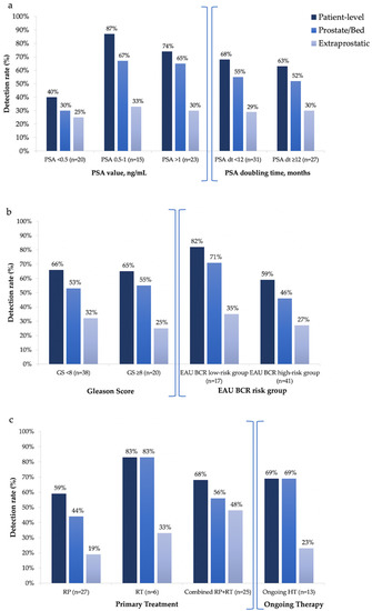 (a) Per-patient and per-lesion detection rate of [18F]Fluciclovine PET/CT in relation to (a) PSA value and PSA doubling time, (b) Gleason Score (GS) and European Association of Urology (EAU) biochemical recurrence (BCR) risk groups, and (c) primary treatments, including prostatectomy alone (RP), radiotherapy alone (RT) or combined (RP + RT), and ongoing hormonal therapy (HT).