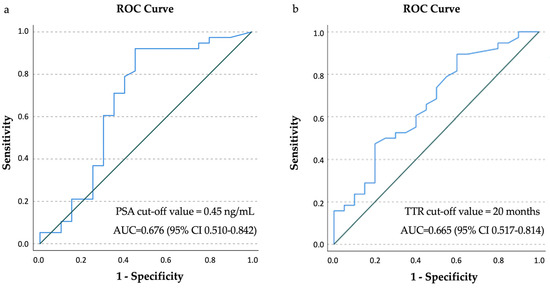 ROC analysis: (a) the PSA optimal cut-off value was 0.45 ng/mL with an AUC of 0.676 and (b) time from primary treatment to PSA relapse (TTR) optimal cut-off value was 20 months with an AUC of 0.665.