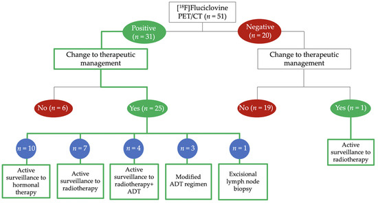Consistent with the LOCATE [9] and FALCON trials [7], a significant change (51%) in therapeutic strategy was observed after the [18F]Fluciclovine PET/CT scan. In the LOCATE and FALCON trials, the most common pre-scan management was salvage radiotherapy. In the LOCATE study, the treatment strategy was frequently changed from salvage radiotherapy or systemic therapy to watchful waiting in [18F]Fluciclovine-negative patients (25%), while in positive ones from ADT to radiotherapy (24%), and less commonly the contrary (9%) [9]. In the FALCON trial, salvage radiotherapy was frequently changed to systemic therapy (24%) after a positive scan or similarly to watchful waiting after a negative one (24%) [7]. In our analysis, the most frequent changes were from clinical surveillance to systemic hormone therapy (38%) or radiotherapy (31%) following a positive scan, avoiding an undertreatment.