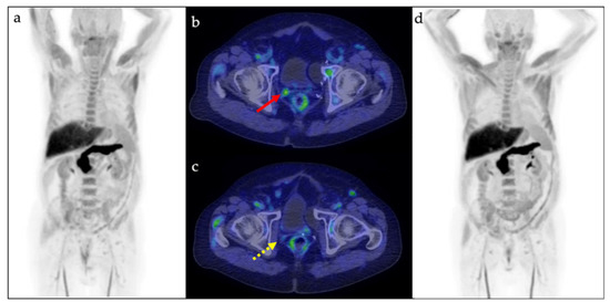(a,b) Pre- and (c,d) post-therapy [18F]Fluciclovine PET/CT in a 72 year-old prostate cancer patient in PSA relapse after prostatectomy (2015). Initial stage was pT2cN0 and Gleason Score 7 (4 + 3), classified as high EAU BCR risk group. At the time of the pre-therapy scan, PSA rose to 0.26 with a PSA doubling time of 5.13 months. [18F]Fluciclovine PET/CT images ((a): Maximum Intensity Projection; (b): axial fused PET/CT) showed increased amino acid metabolism in right prostatectomy bed (red arrow). Then, therapeutic strategy was changed, and patient started radiotherapy. After 4 months, post-therapy [18F]Fluciclovine PET/CT images ((c): axial fused PET/CT; (d): Maximum Intensity Projection) documented a metabolic response (yellow dotted arrow), confirmed by the following PSA reduction (0.05 ng/mL).