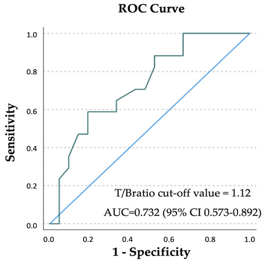 As regards semiquantitative evaluation, a significantly higher T/BratioRL value (p = 0.014) was observed in the extraprostatic disease subpopulation (Table 5). ROC analysis identified a T/BratioRL optimal cut-off value of 1.12 (sensitivity 88%; specificity 43%) with an AUC of 0.732 (95% CI 0.573–0.892), associated with more likely extraprostatic disease (Figure 6).