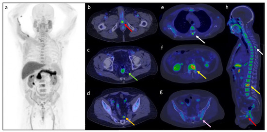 [18F]Fluciclovine PET/CT in a 68 year-old prostate cancer patient in PSA relapse after prostatectomy (2011). Initial staging was pT2aN0R0 and Gleason Score 7 (3 + 4), classified as high EAU BCR risk group. At the time of the exam, PSA value rose to 0.76 ng/mL with PSA doubling time of 3.4 months. The images ((a): Maximum Intensity Projection; (b–g): axial fused PET/CT; (h): sagittal fused PET/CT) showed increased [18F]Fluciclovine uptake in prostatectomy bed with SUVmax 6.4 and T/Bratio 1.6 (red arrow), in left pararectal lymph node with SUVmax 1.9 and T/Bratio 0.95 (green arrow), in the left presacral lymph node with SUVmax 8.0 and T/Bratio 2.0 (orange arrow), in the spinous process of D4 vertebra with SUVmax of 6.3 and T/Bratio 1.5 (white arrow), in L3 vertebra with SUVmax 9.0 and T/Bratio 2.2 (yellow arrow) and left iliac bone with SUVmax 6.0 and T/Bratio 3.0 (pink arrow).