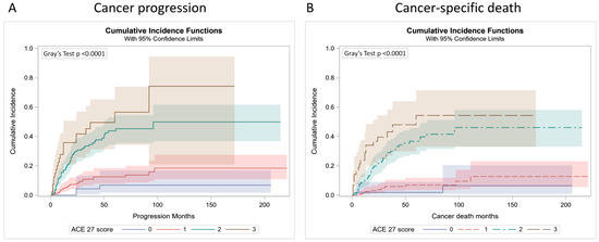 Cumulative incidence function for cancer progression (A) and cancer-specific death (B) according to the ACE-27 score: 0, none; 1, mild; 2, moderate; 3, severe.