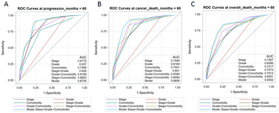 Receiver operator characteristic (ROC) analysis of seven models for predicting progression-free survival (A); cancer-specific survival (B) and overall survival (C) at five years.