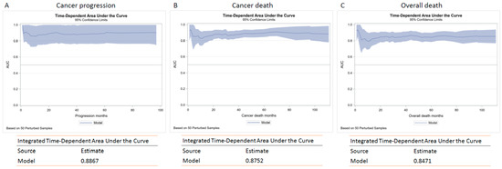 The integrated time-dependent AUC for progression-free survival (A); cancer-specific survival (B) and overall survival (C).